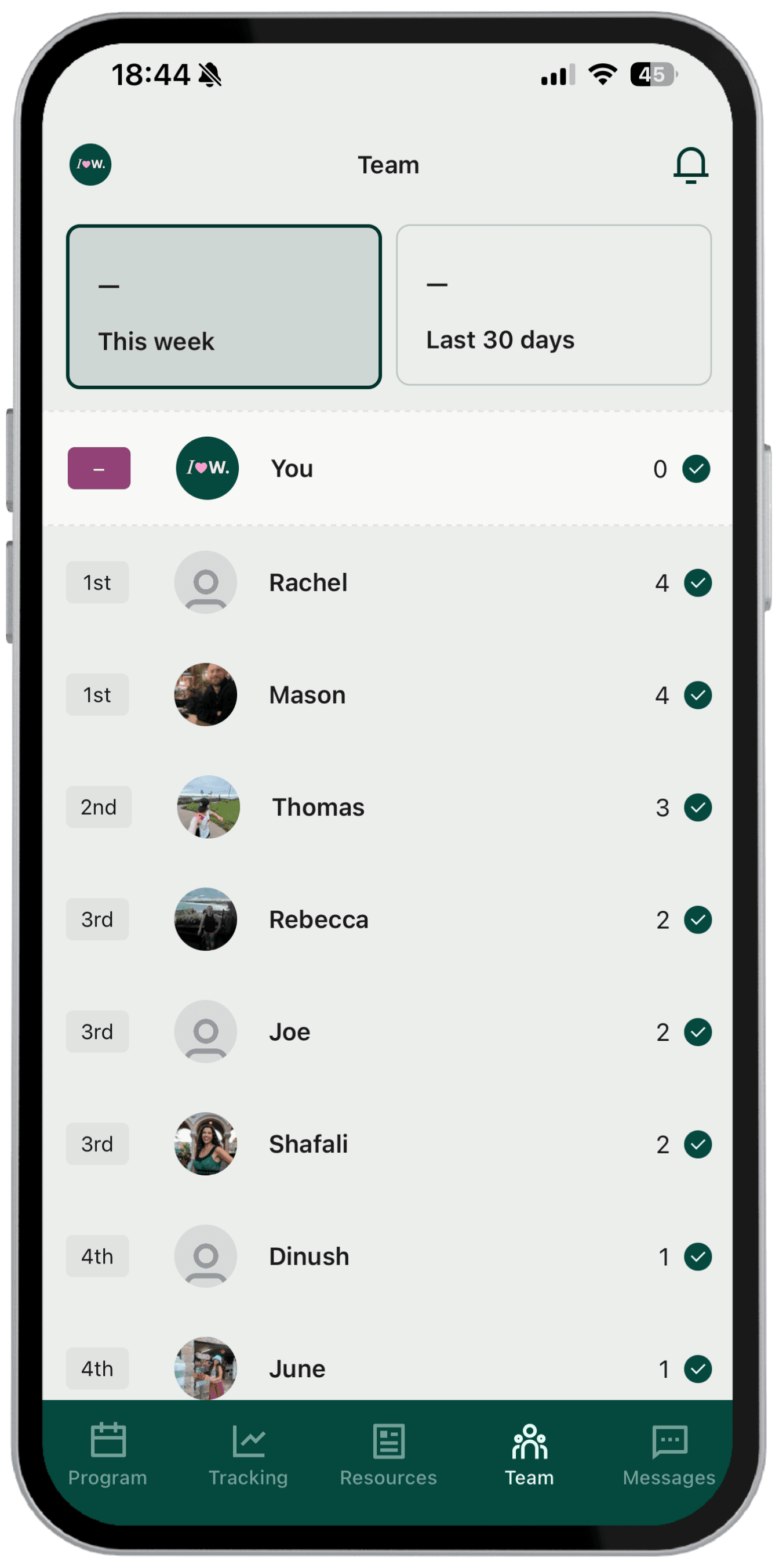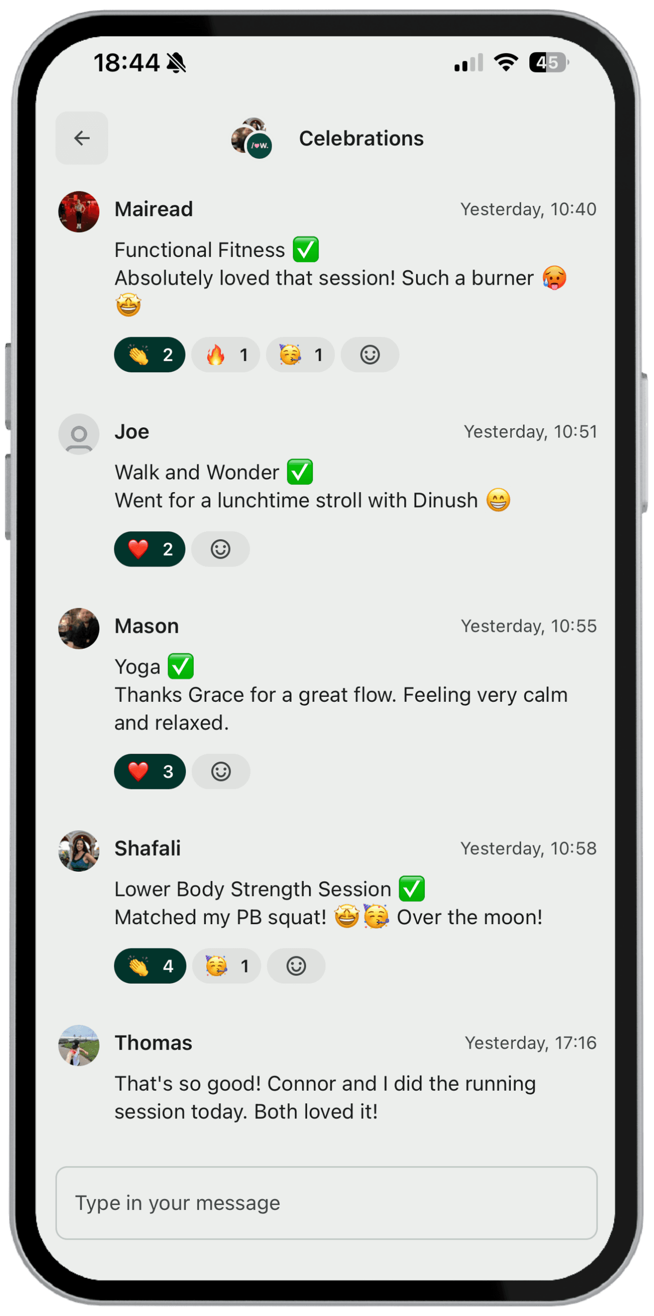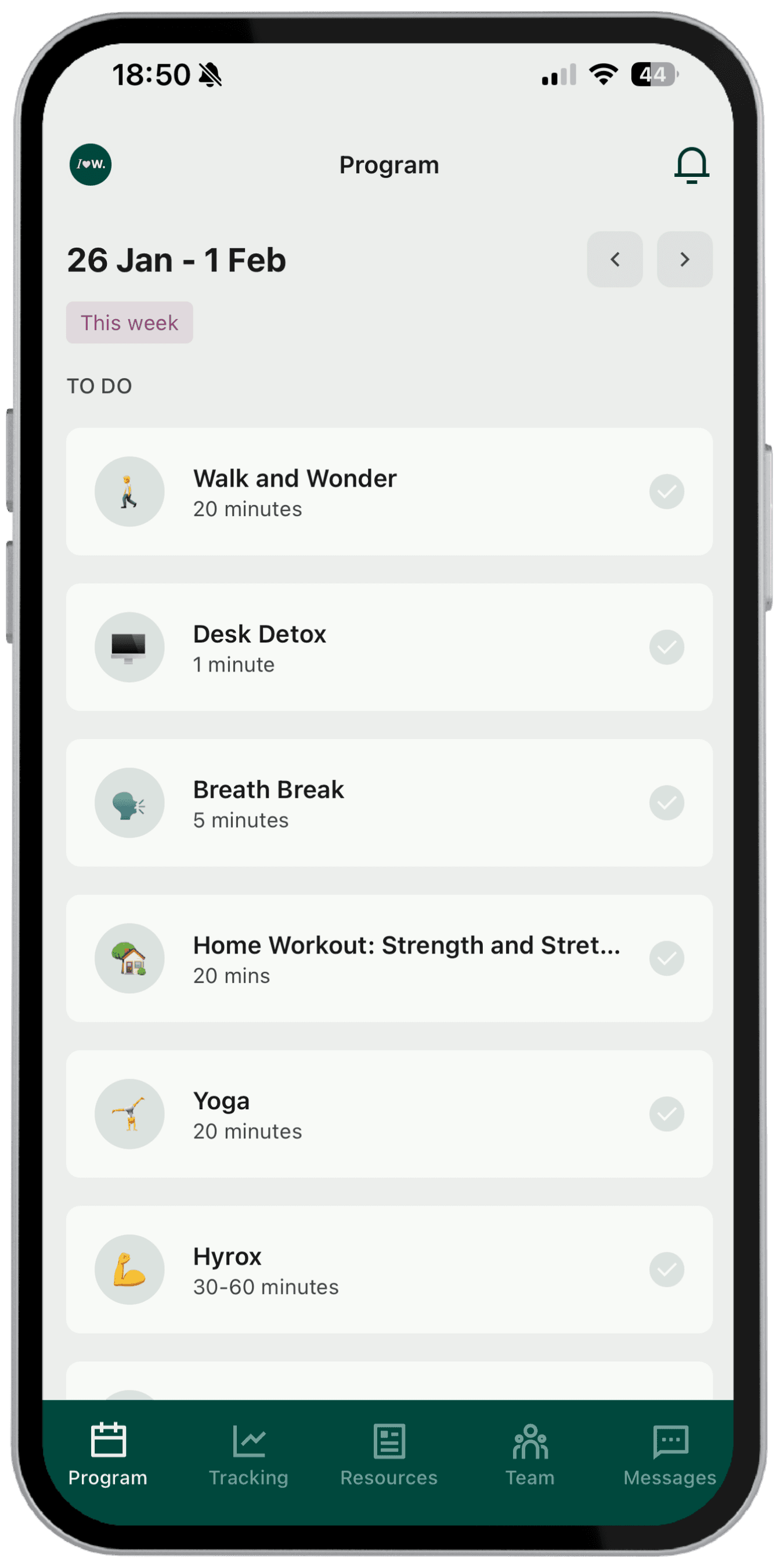 In-House is a continuous, coach-led workplace wellbeing programme delivered through one all-in-one app. Instead of one-off initiatives or short-term challenges, we provide a rolling 365-day wellbeing calendar designed to embed movement, connection and behaviour change into everyday working life.